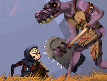 Parvus fights with spear and shield against enormous creatures. Patience and strategy always win out over aggressive attacks.